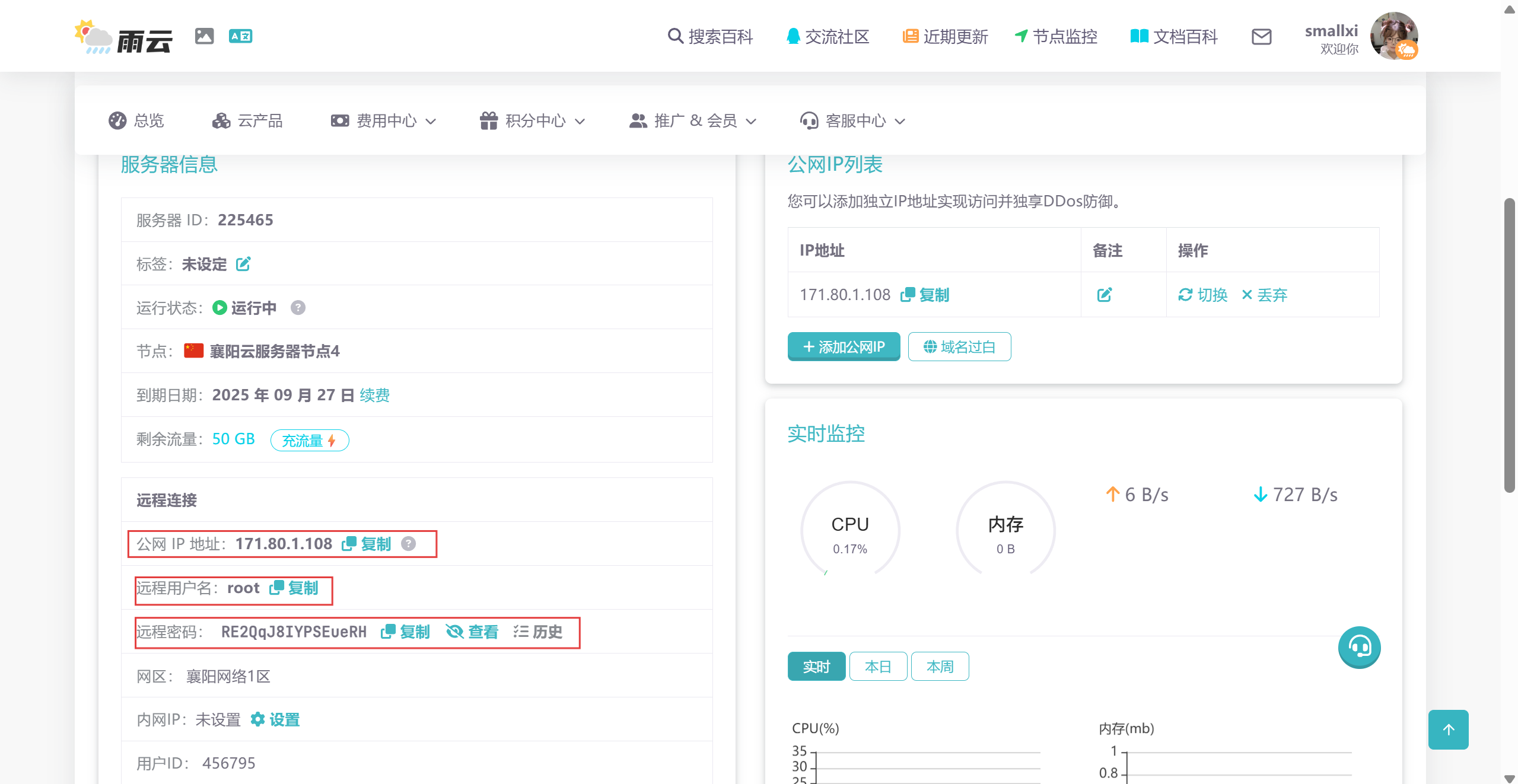 假设你已在雨云平台购买并创建了一台云服务器,并获取了以下信息: