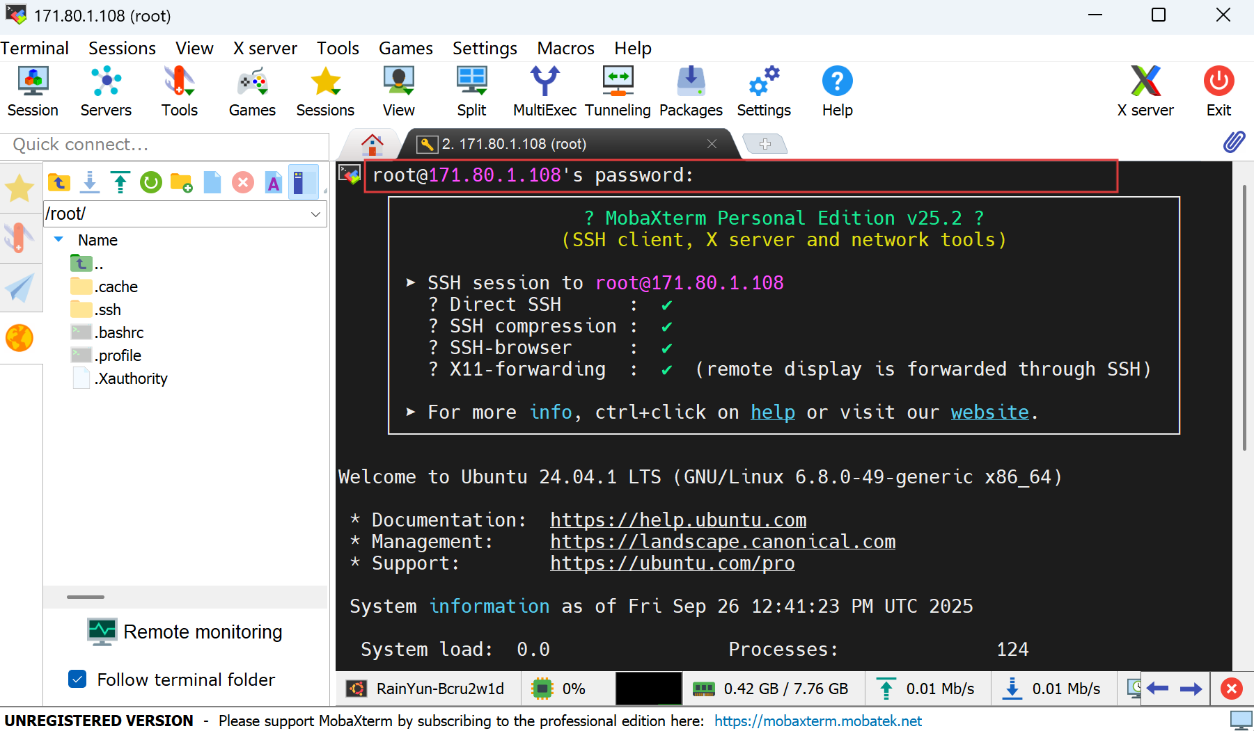 - 点击 "OK" 后,MobaXterm 将尝试连接服务器。
