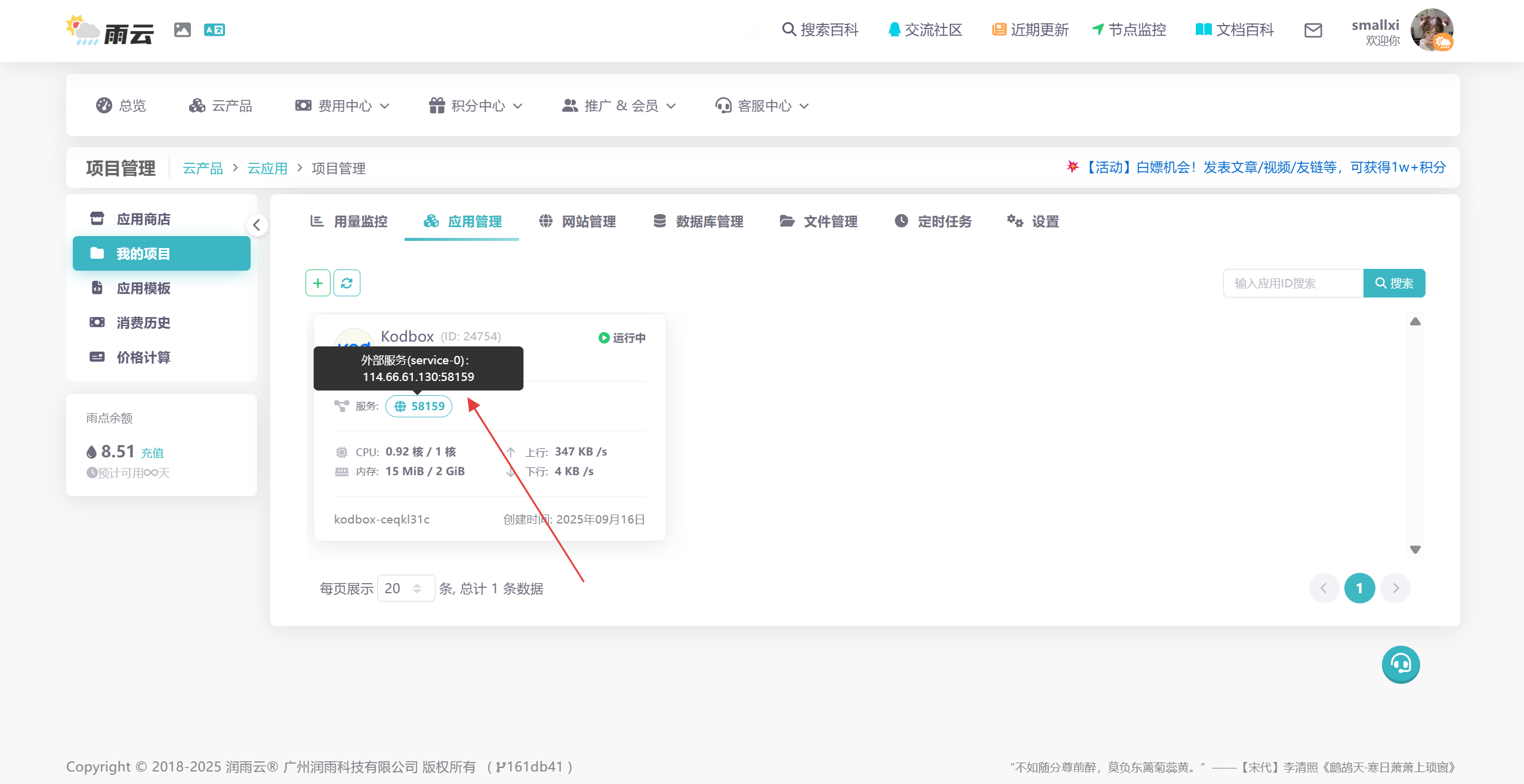 🧾 安装完成后,进入【我的项目】→【应用管理】查看 IP 和端口